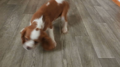 Kate is a small frame blenheim Cavalier. She is a new addition to the kennel. She loves attention. She is calm and loves all the other dogs. She weighs about 11 pounds. She is genetically clear!