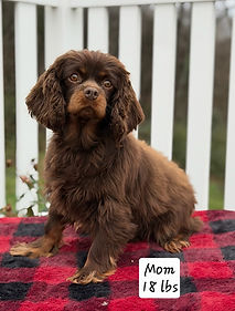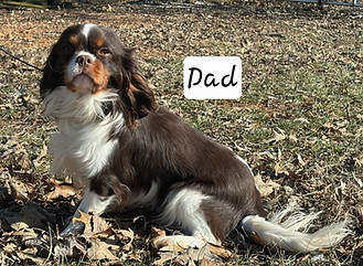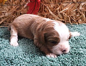 Tilley was raised at the kennel. Her mother was a solid chocolate cavalier. Tilley is a chocolate tricolor Cavalier. She is very playful and still has some growing to do. She weighs about 10-11 pounds.