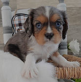 Dolly is a beautiful tri blue merle Cavalier. She is AKC registered. She is a little firecracker who loves attention and to run and play. She has very colorful cavapoo puppies. Dolly weighs about 13-14 pounds.